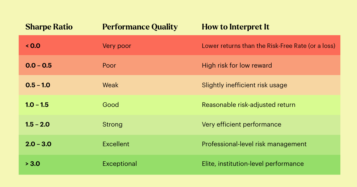 De interpretatie van een Sharpe-ratio ligt niet 100% vast en het is aan de belegger of het handelshuis om te bepalen welke waarde zij passend vinden. Wel staat vast dat een hogere Sharpe-ratio wijst op een efficiënter gebruik van risico. Hieronder vind je een overzicht van algemeen gehanteerde bandbreedtes bij trading firms om de kwaliteit van een strategie te beoordelen – van “het extra risico niet waard” tot “institutioneel topniveau”.
